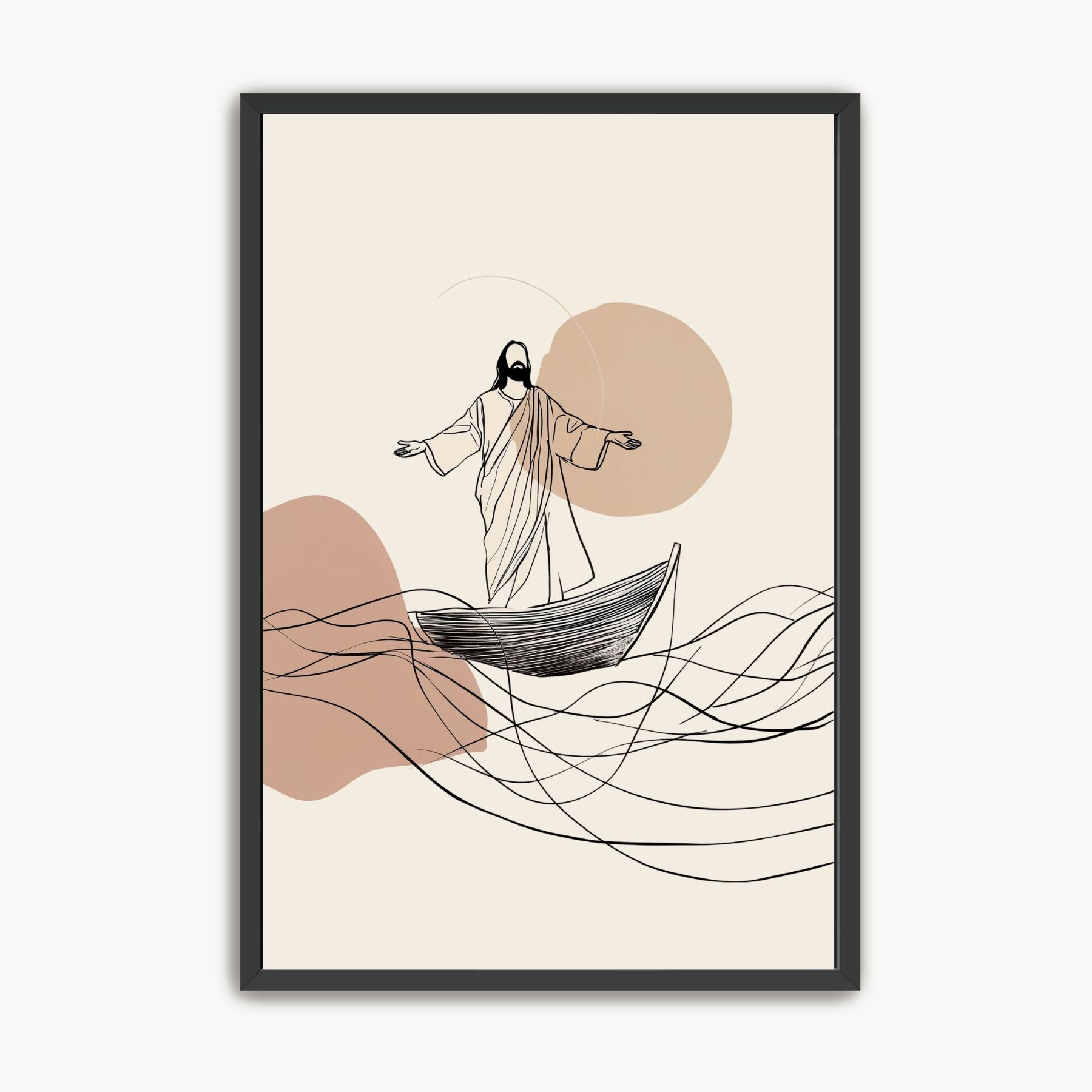 This minimalist line art wall art captures the powerful moment of Jesus calming the storm in a modern abstract design. Soft neutral tones and warm beige accents create a peaceful yet faith-filled atmosphere for any Christ-centered home. The flowing lines reflect life’s waves, while Christ stands steady above them. This modern Christian wall art serves as a daily reminder that Jesus brings peace in chaos and authority over every storm.