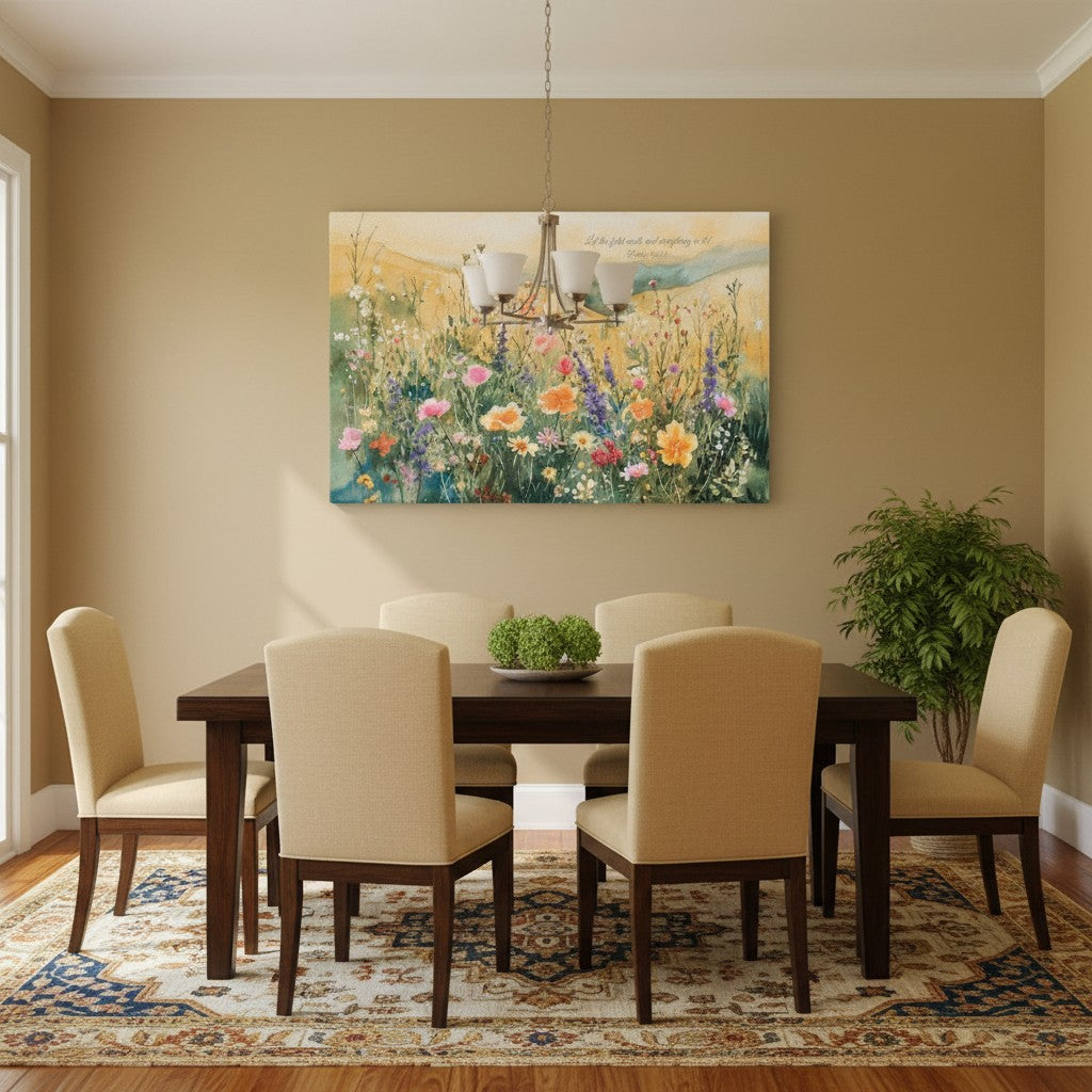 Celebrate God’s glory in creation with this “Let the Field Exult” Wildflower Watercolor wall art. Inspired by Psalm 96:12—“Let the field exult, and everything in it!”—this artwork captures a field bursting with colorful wildflowers, reminding us that all creation joins in praising the Lord. A joyful piece for any home, this canvas points hearts to God’s majesty and invites worship through beauty. Fine art print and canvas available.