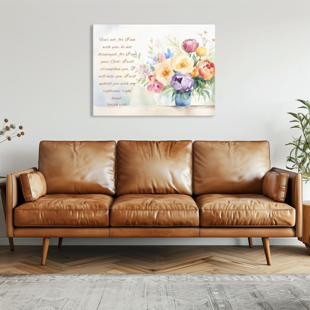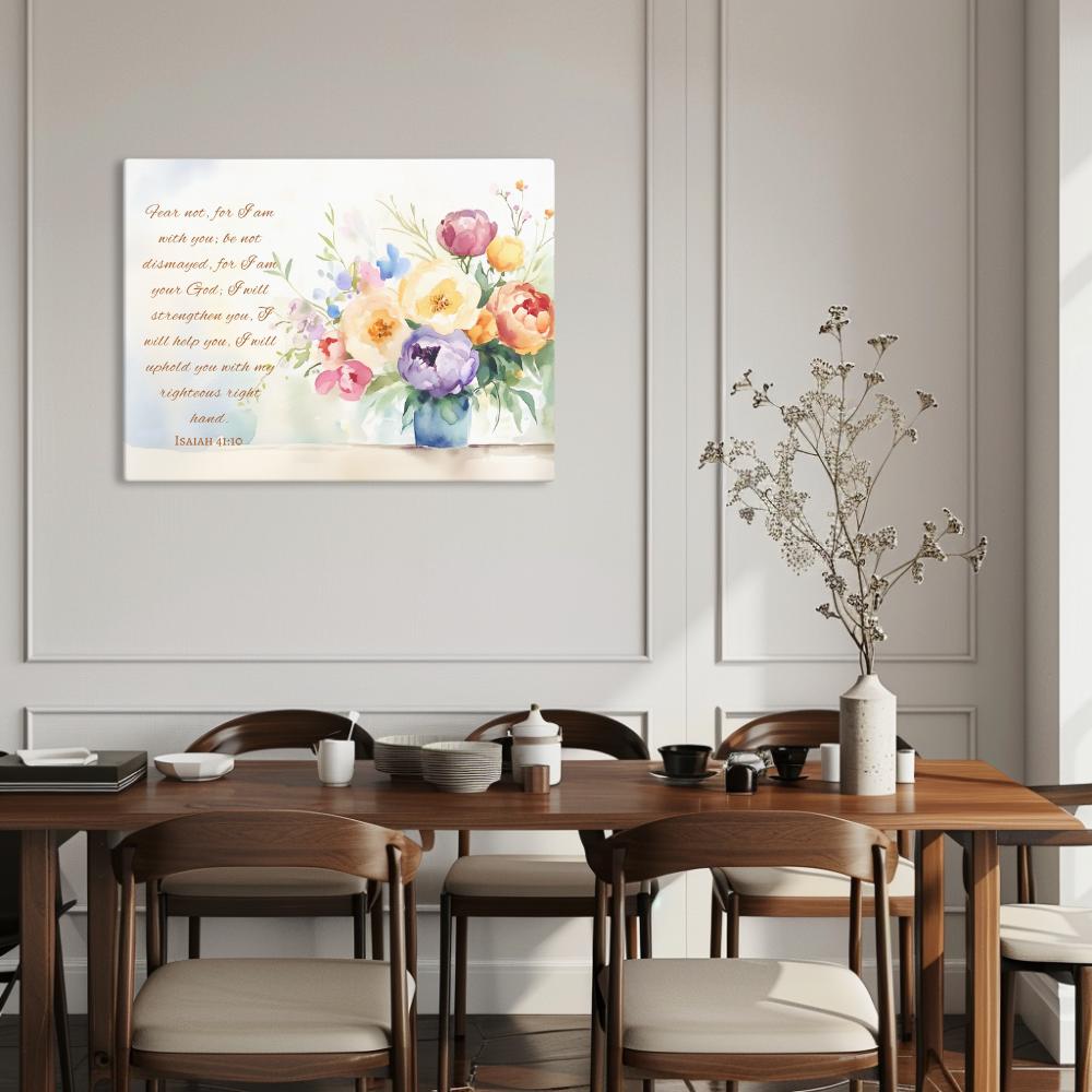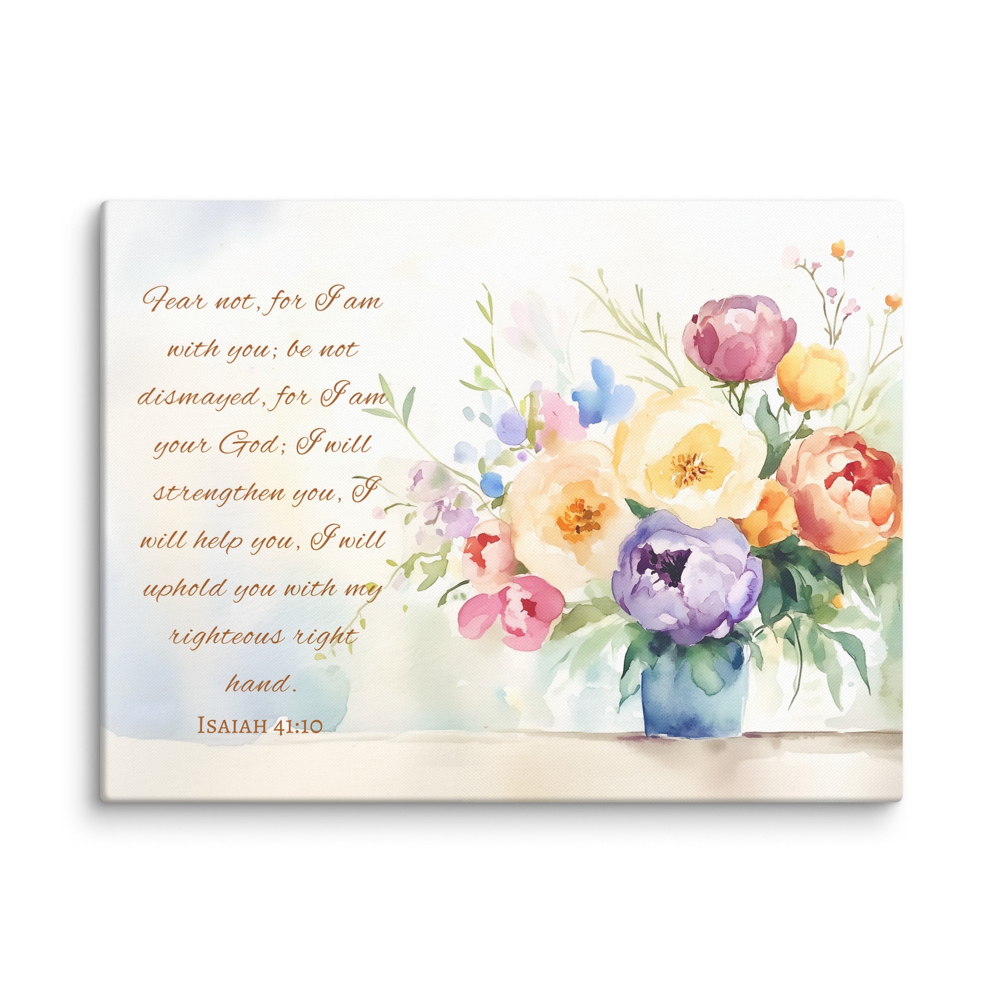 Be encouraged by God’s promise in Isaiah 41:10 with this “Fear Not” Blooming Peonies wall art: “Fear not, for I am with you; be not dismayed, for I am your God; I will strengthen you, I will help you, I will uphold you with my righteous right hand.” Featuring a soft watercolor bouquet of vibrant peonies in pink, purple, yellow, and orange, this artwork reminds you of God’s presence and strength in times of fear or uncertainty. Fine art print and canvas available.